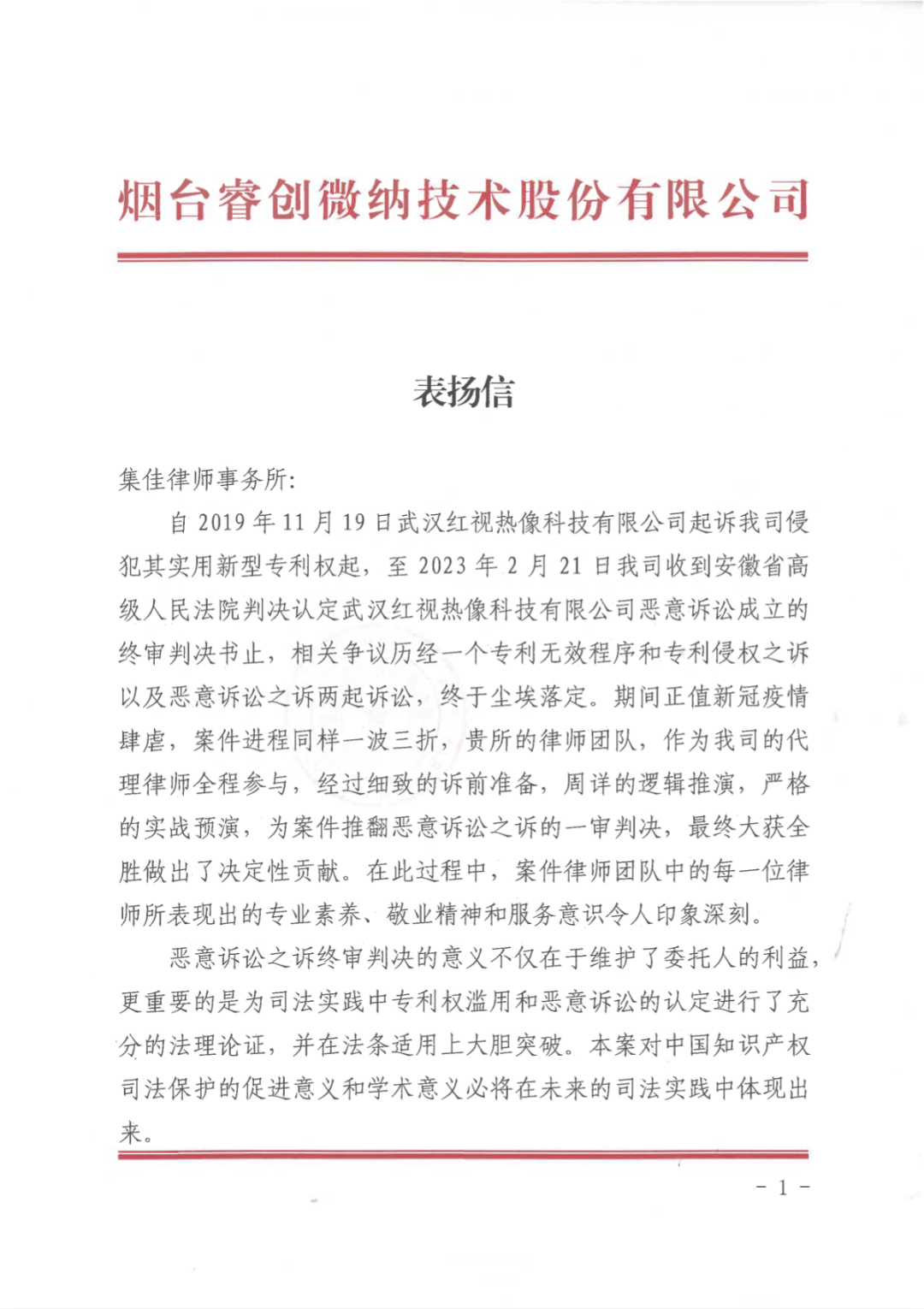 2023年2月10日,安徽省高级人民法院就烟台睿创微纳技术股份有限公司、烟台艾睿光电科技有限公司、安徽英睿系统技术有限公司等(下称“睿创集团”)与武汉红视热像科技有限公司(下称“武汉红视”)因恶意提起知识产权诉讼损害责任纠纷一案作出终审判决,认定武汉红视滥用诉权的行为构成恶意诉讼,并判令其赔偿睿创集团相应的合理支出。至此,时隔四年,横跨疫情时代的专利侵权及恶意诉讼系列纠纷案,终于尘埃落定。澳客协助睿创集团最终取得系列案件的全面胜利,维护了客户合法权益,实现了商业竞争的公平正义!
